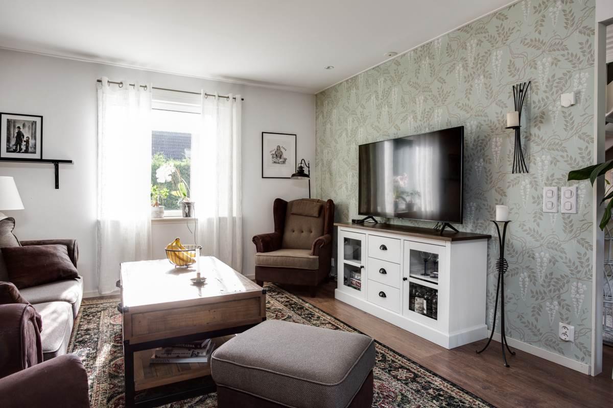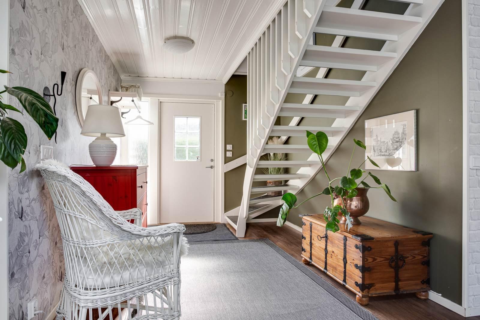 Välkommen in i en öppen och luftig hall med trapp upp till ovanvåningen. Från hallen leds du direkt in till ett ljust kök med öppen planlösning mot vardagsrum och gott om plats för matbord och stolar. Härifrån nås det inglasade uterummet med skjutdörrar ut mot altandäck och tomtens baksida. På entréplan finns även badrum, stort sovrum och tvättstuga. På ovanvåning finns ett stor hall som kan användas som allrum, badrum och två sovrum varav ett som med enkelhet kan göras om till två sovrum om så önskas. På fastigheten finns även carport, förråd och utespa med poolhus.